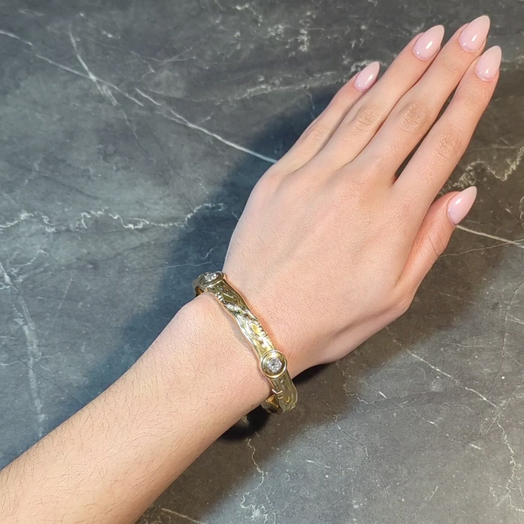Art Nouveau Diamond 14 Karat Yellow Gold Antique Poppy Flower Bangle Bracelet