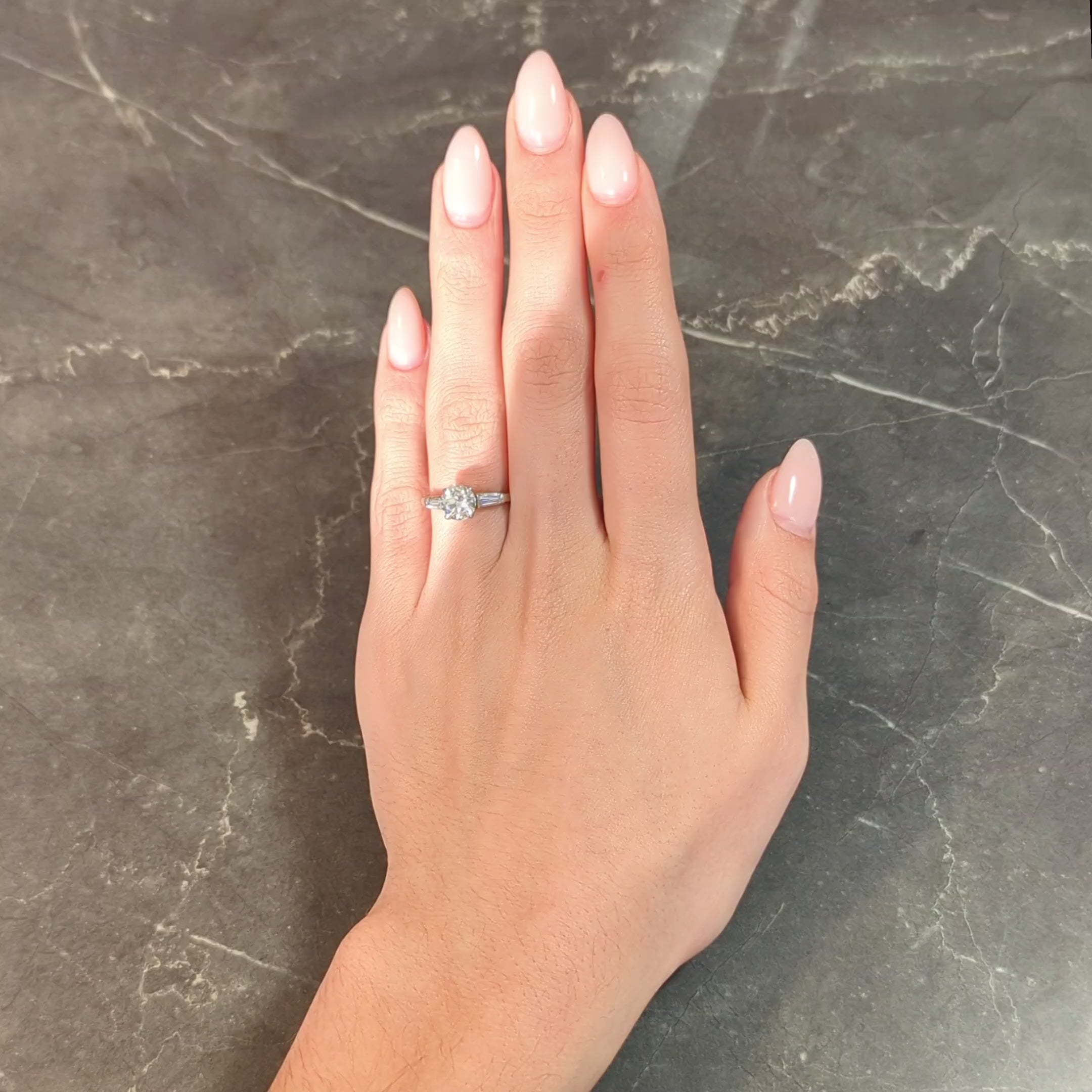 - Flanked by cathedral shoulders bar set with tapered baguette cut diamonds