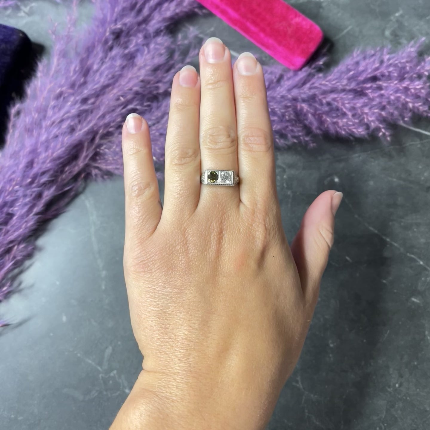 - East to West rectangular mounting featuring two old European cut diamonds