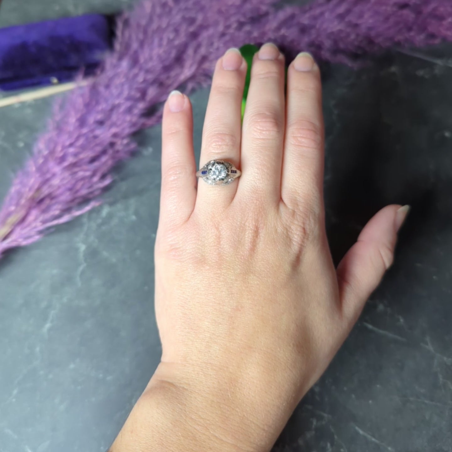 Art Deco 1.19 CTW Old European Cut Diamond Sapphire Platinum Ribbon Antique Engagement Ring