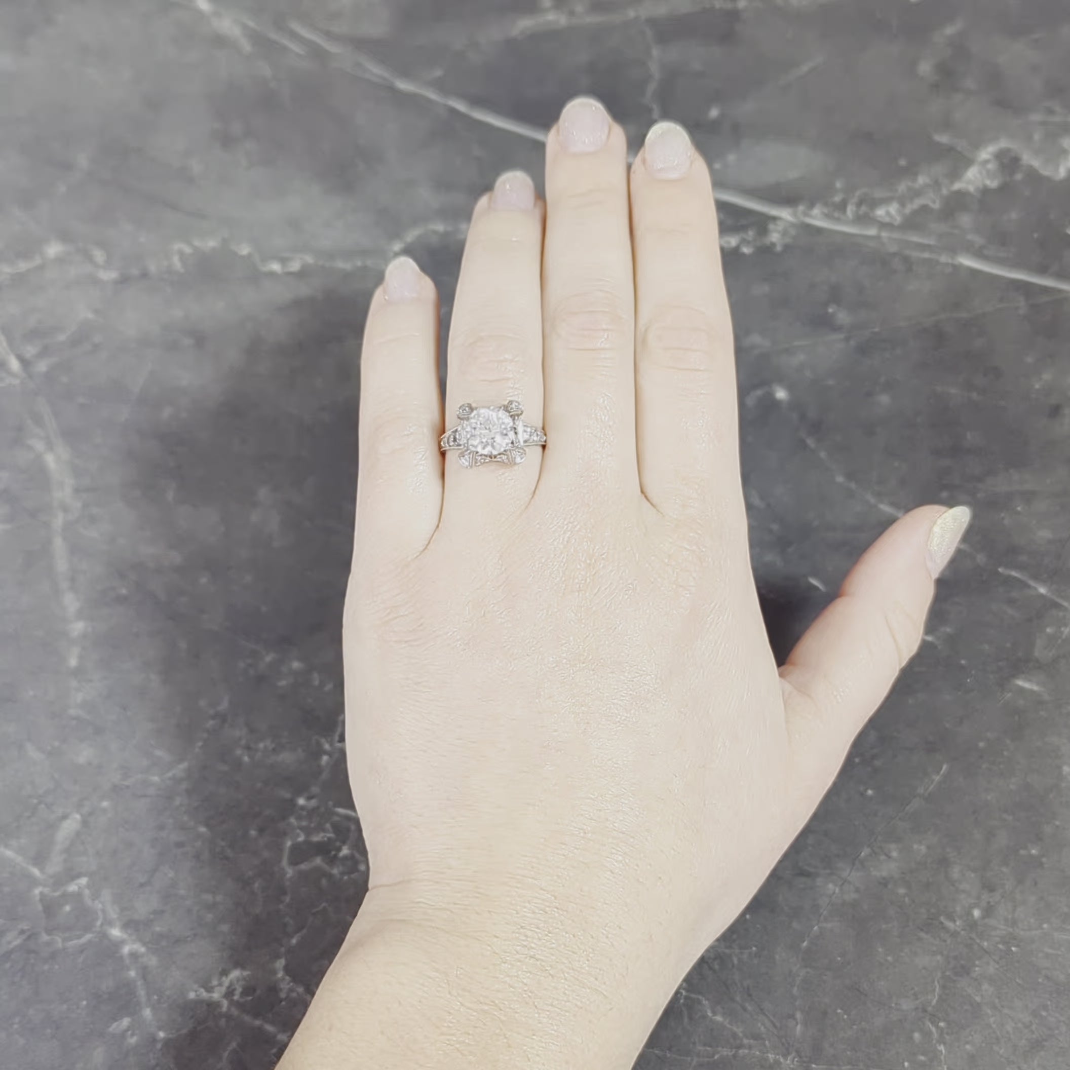 - Set with decorous grooved prongs with milgrain detailing in a cushion shaped surround