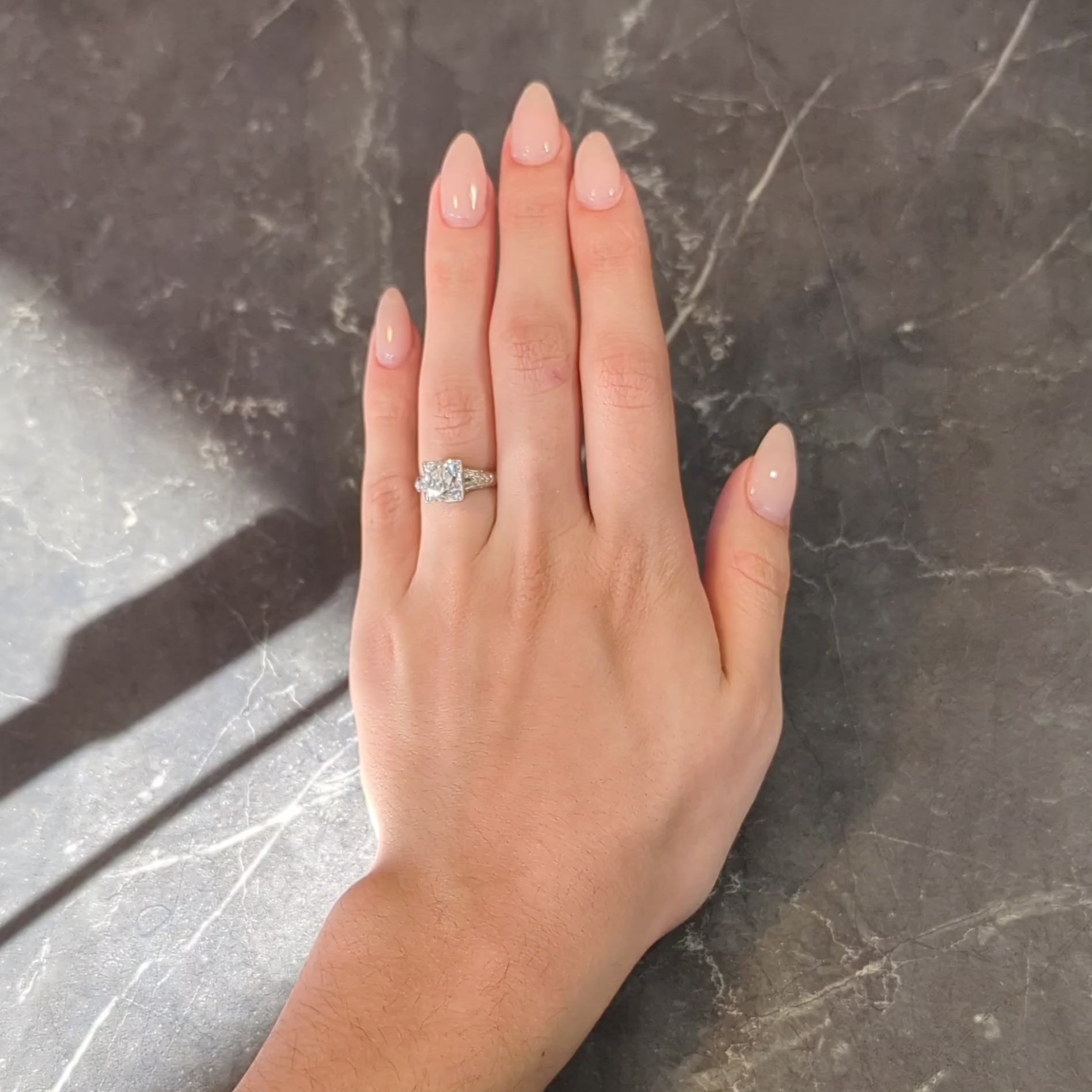 - Bead set in a square form head with milgrain edges and flanked by cathedral shoulders