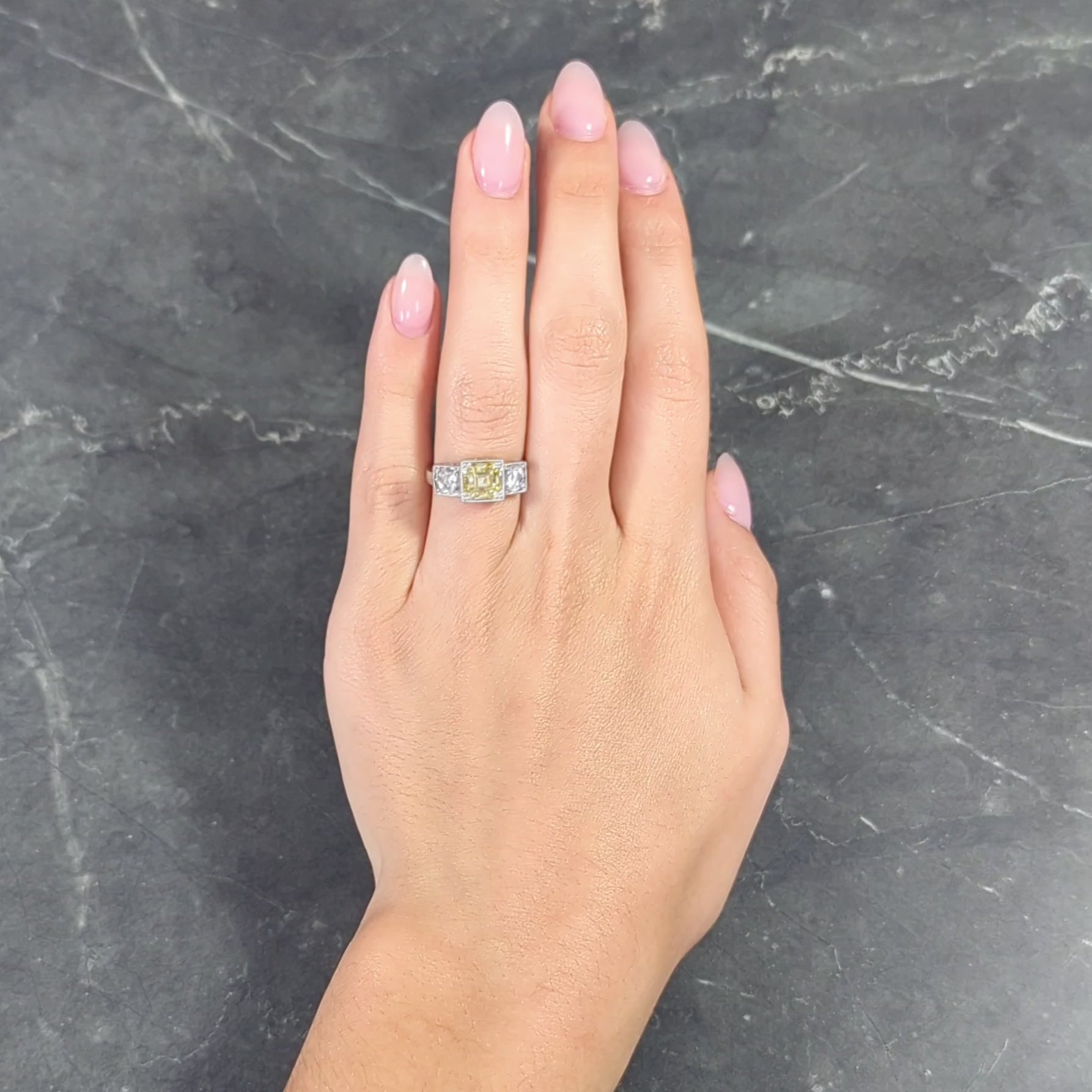 Adorn your hand with this exquisite Art Deco diamond ring. Crafted with a dazzling 3.20-carat Asscher cut Fancy Intense Yellow and old European cut diamonds, it is a timeless addition to your jewelry collection. Encased in a luxurious platinum foliate setting, it's a must-have for discerning jewelry fans.