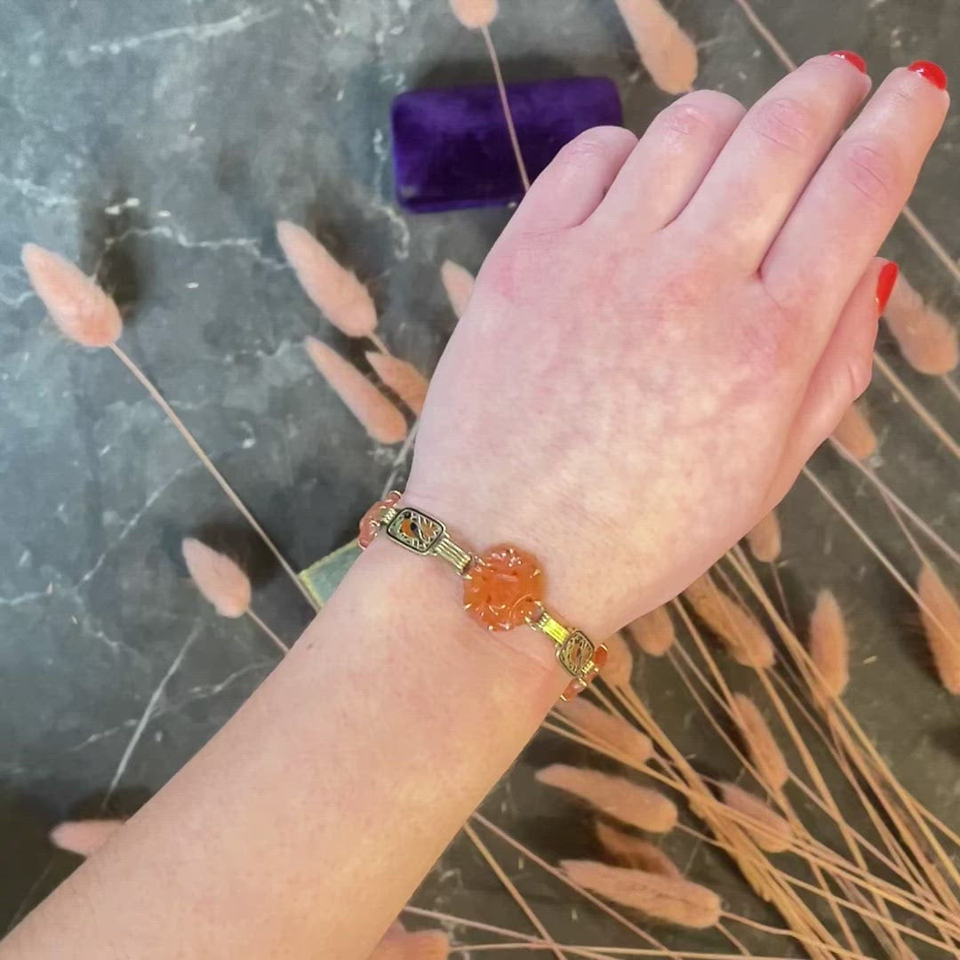 - Link bracelet features three 16.0 mm round prong set and deeply carved floral carnelian links