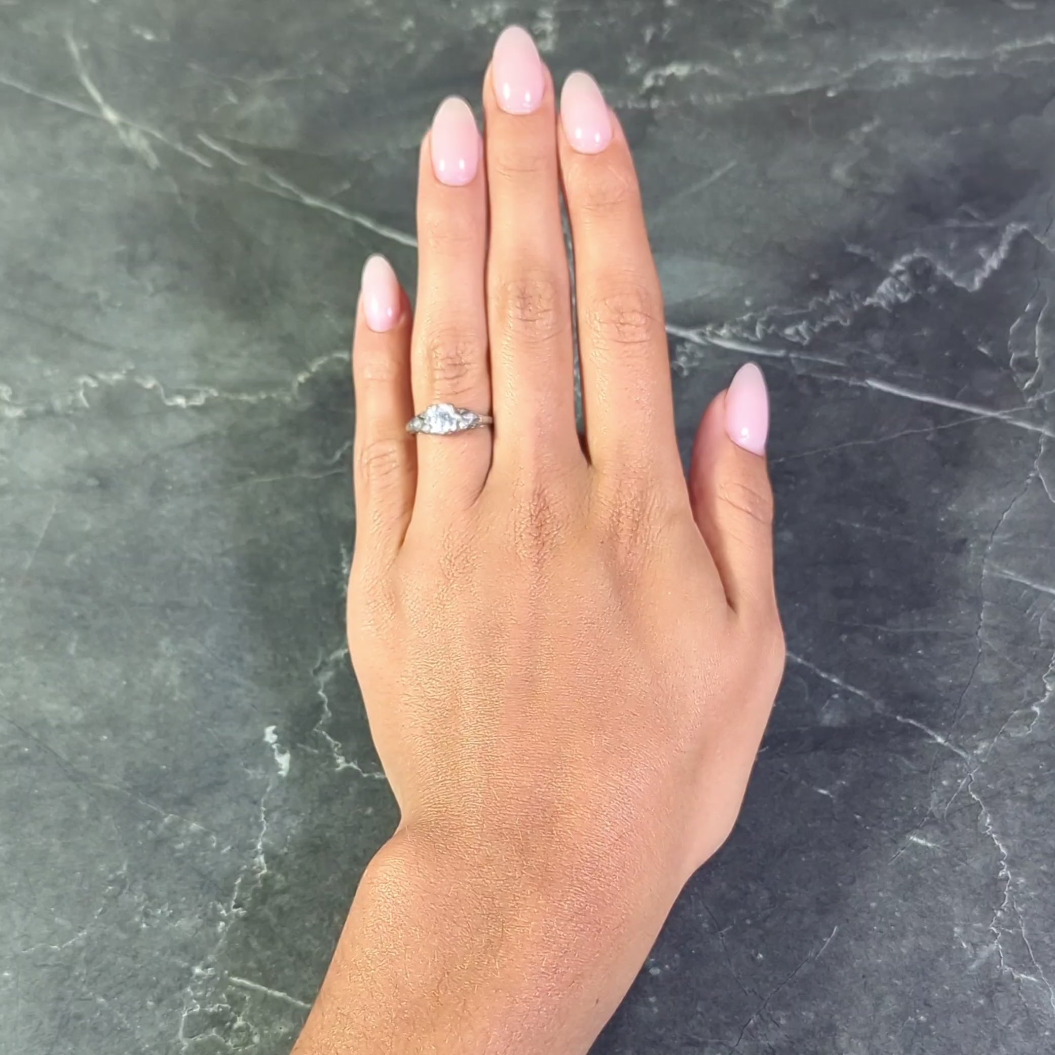 - Flanked by single-cut diamonds bead set in faceted geometric shoulders