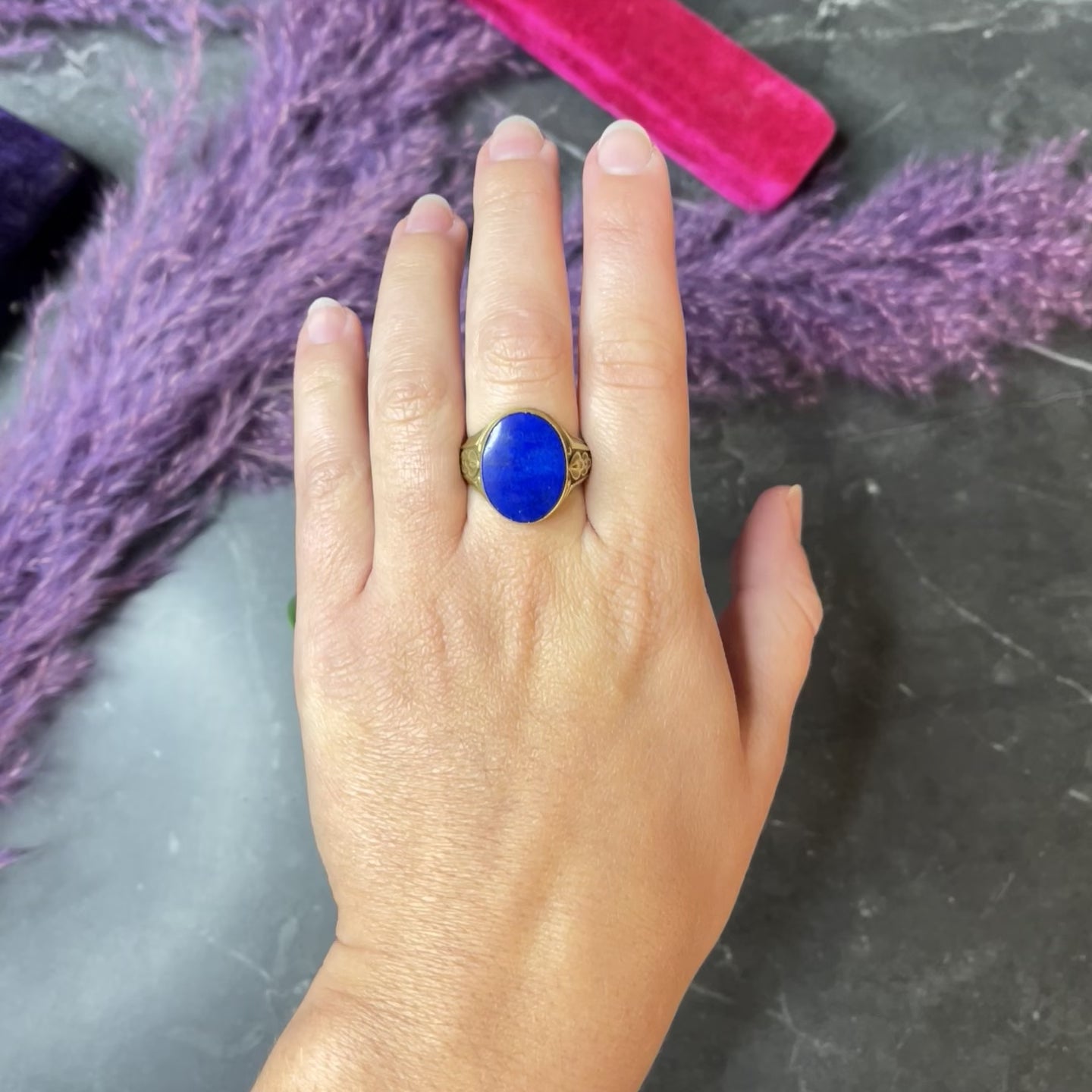 Art Deco Lapis Lazuli 14 Karat Green Gold Unisex Foliate Signet Ring