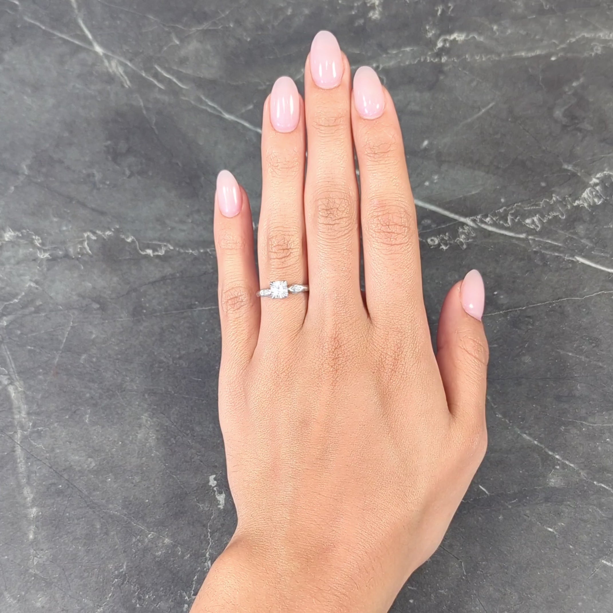 - Set with tri-split prongs in a square form head and flanked by marquise cut diamonds