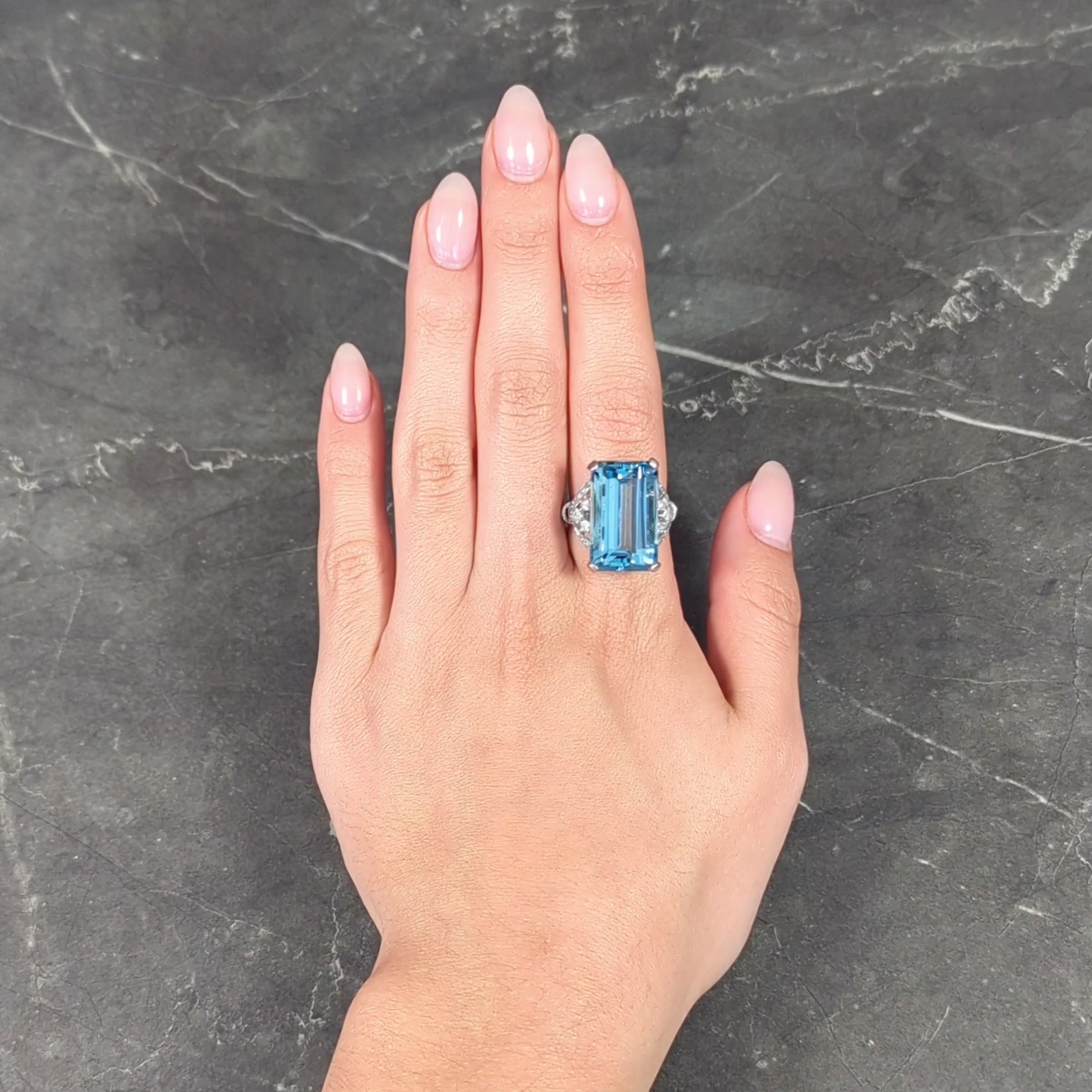 - Centering an emerald cut aquamarine weighing approximately 20.10 carats - transparent medium pastel blue