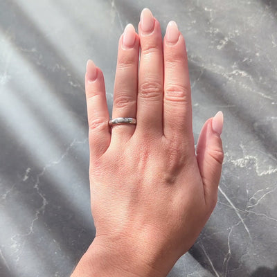 - Designed as a curved platinum band with round brilliant cut diamonds