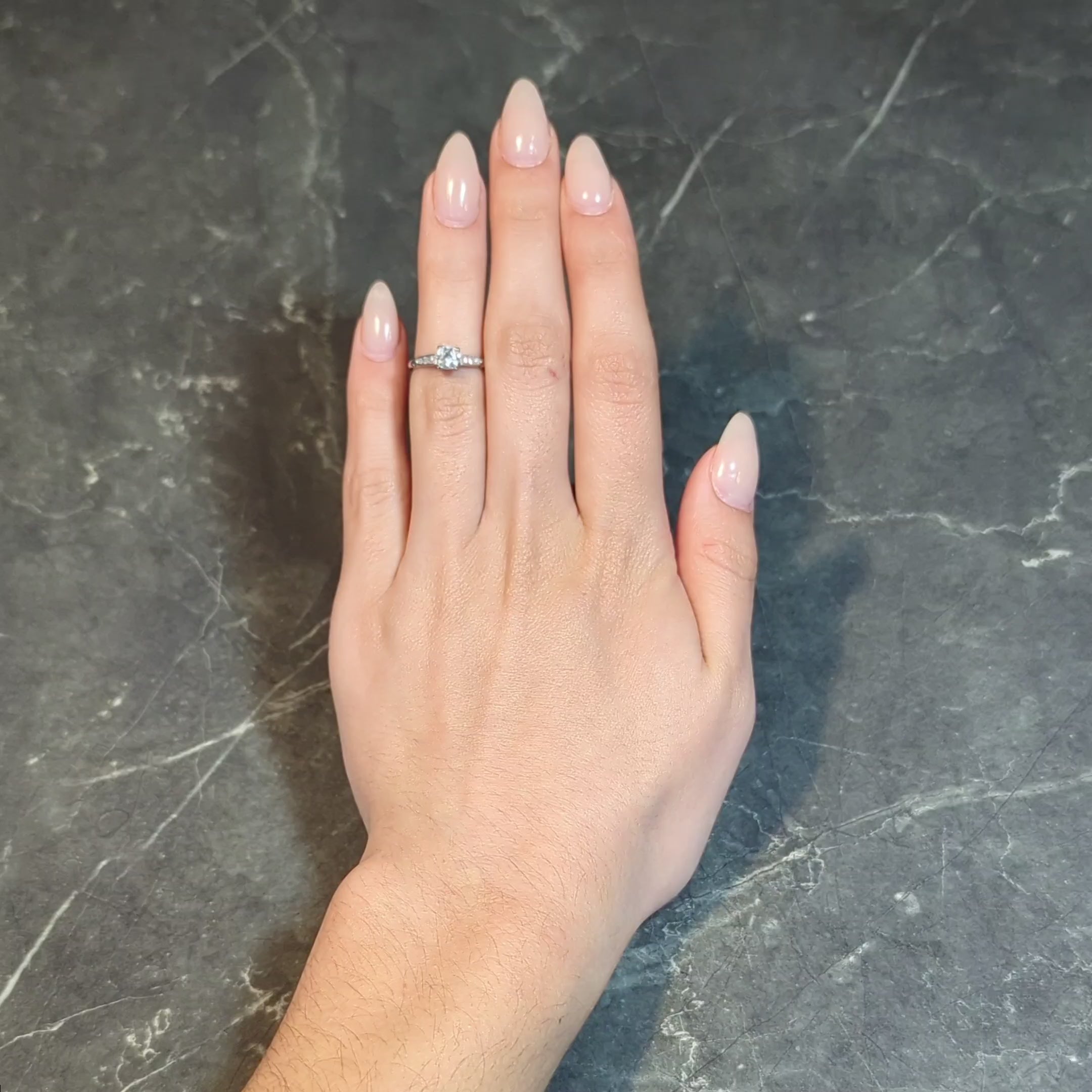 - Flanked by cathedral shoulders channel set with single cut diamonds